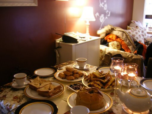 這些是比比和怡君他們忙了好幾個小時的心血結晶。有好吃的三明治、鬆餅和巧克力捲。其中鬆餅配上IKEA的果醬非常美味。但是最重要的是比比親手做的紅茶戚風蛋糕!這個使用英國阿薩姆紅茶做出的戚風蛋糕,吃起來口感綿密又帶著溫和的茶香。外貌可能不怎麼樣,味道可是非常美味呀!要不是因為還有滿桌的餐點在,平常時要我配著紅茶吃下半個應該沒問題吧XD。