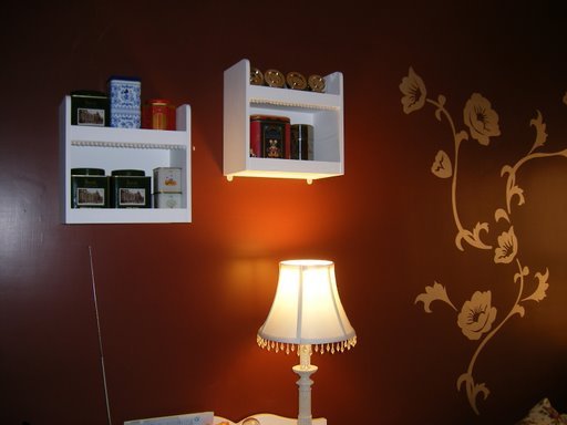 牆上的花紋和白色的製物架子都是比比裝飾上去的。