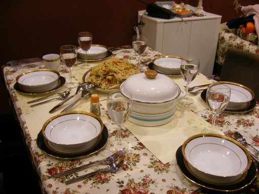 沒想到吃吃喝喝又談天看電視一陣子之後,大家又餓了@@(真是不可思議啊...)。於是由豆豆和科小蒸情侶檔到廚房一展伸手,端出了香噴噴的清炒蔬菜雞肉義大利麵(名字這樣取應該很適合吧XD?)。然後我也隨手弄了個牛奶玉米濃湯,就完成了一頓美味的晚餐囉