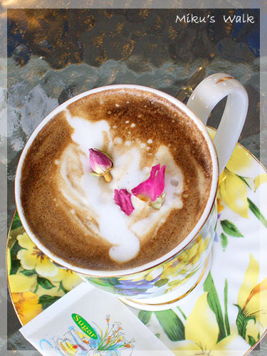 我點的玫瑰拿鐵。上面的奶泡圖案已經散掉了(倒)...